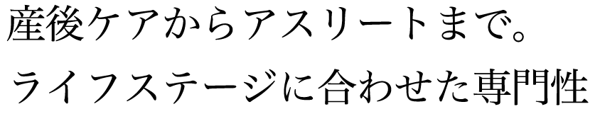 「ママの笑顔」から「競技パフォーマンス向上」まで幅広くサポート。アスラボ.には、産後骨盤矯正などのデリケートなケアから、本格的なダイエット・美ボディメイク、さらにはスポーツ現場で求められる高度な動作改善まで、各分野に特化した専門メニューが揃っています。「今の自分に何が必要か」を、その時のライフステージに合わせて柔軟に相談できる「一生のパートナー」となります。