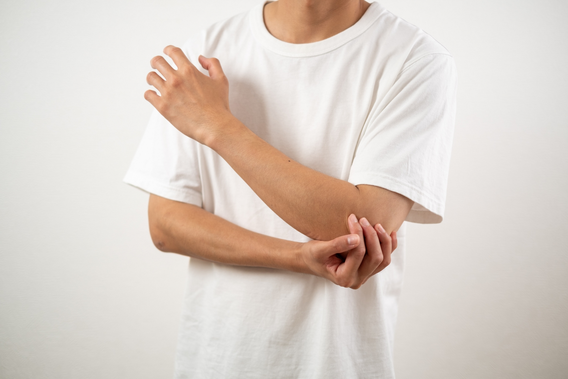 正式には内側上顆炎といい、手首を曲げる筋肉や指を握る筋肉が関係しているとされています。腕を使う動作が続くことで、肘の内側に負担がかかることで起こる場合があります。