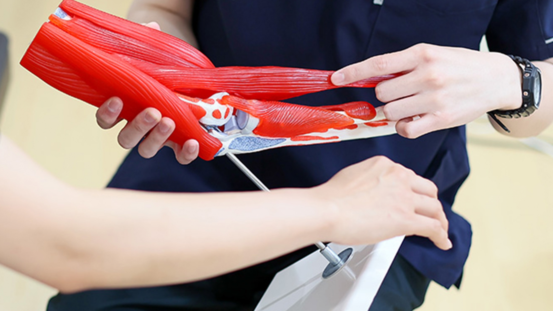 ゴルフ肘は、手首を曲げたり物を握ったりする際に使われる筋肉が繰り返し使われることで、肘の内側にある腱へ負担がかかり炎症が起こることで発症するとされています。これらの筋肉は肘の内側に付着しているため、手首を曲げる動作が続くことで腱の付着部に負担が集中することがあります。